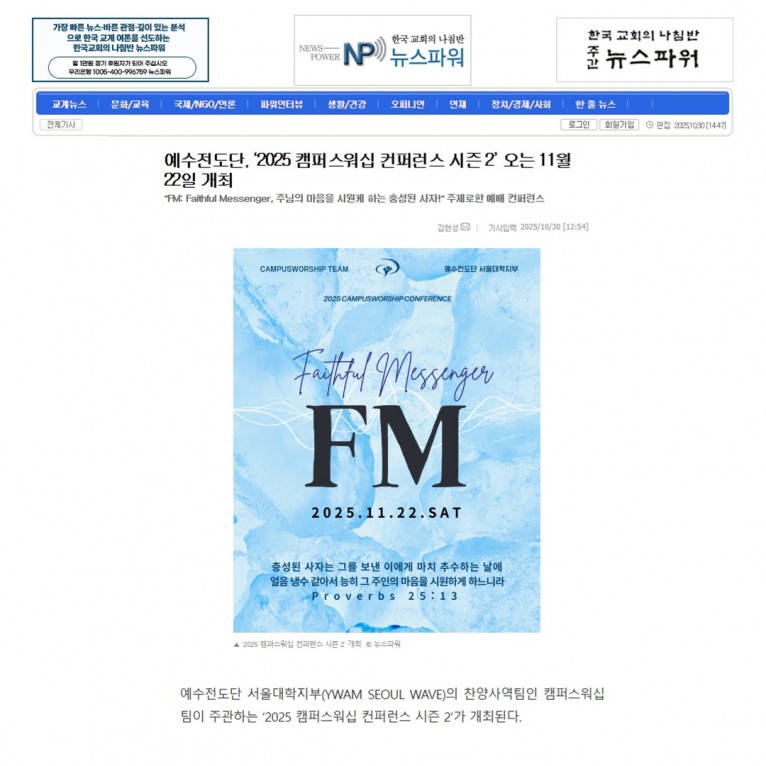 뮤직타임 [기사] 예수전도단, ‘2025 캠퍼스워십 컨퍼런스 시즌 2’ 오는 11월 22일 개최(뉴스파워)